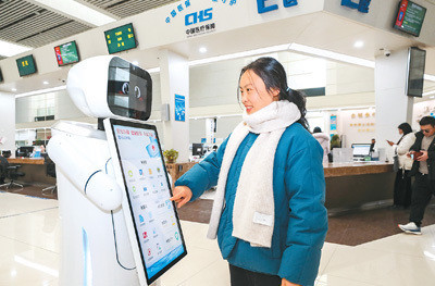 在江苏省淮安市,市民在市政务服务中心利用“AI医保机器人”办理医保业务。 赵启瑞摄(人民视觉)